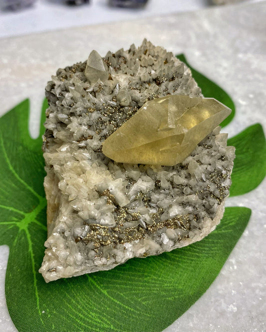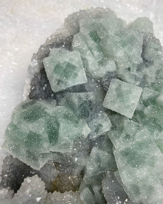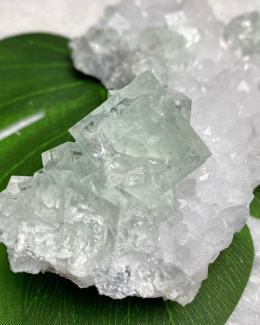 Green Cubic Sugar Fluorite with Quartz Statement Piece