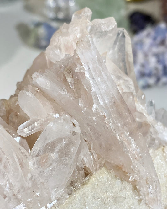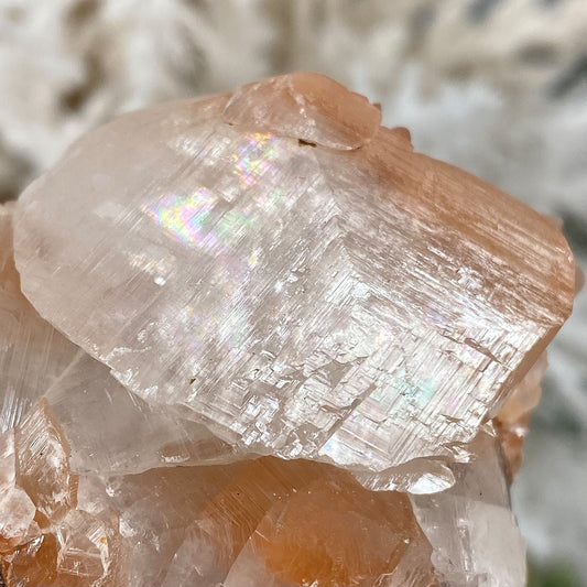 Peachy Red & Clear Calcite Cluster with Rainbow Flash
