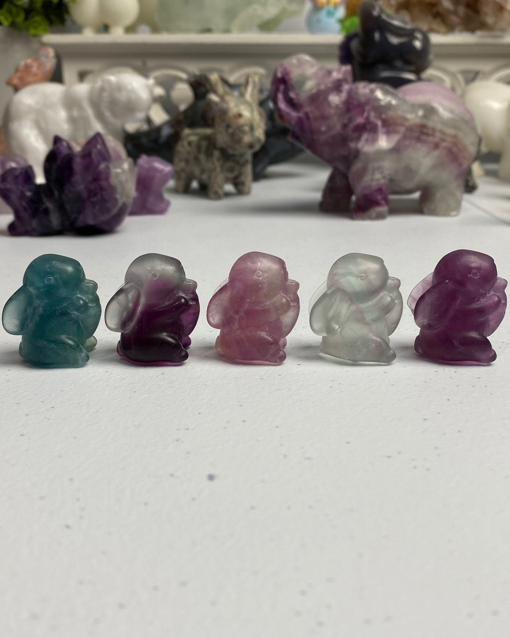 Cute bunny holding a carrot carving made in candy fluorite. Please choose which one you'd like (refer to the picture with the stickers).