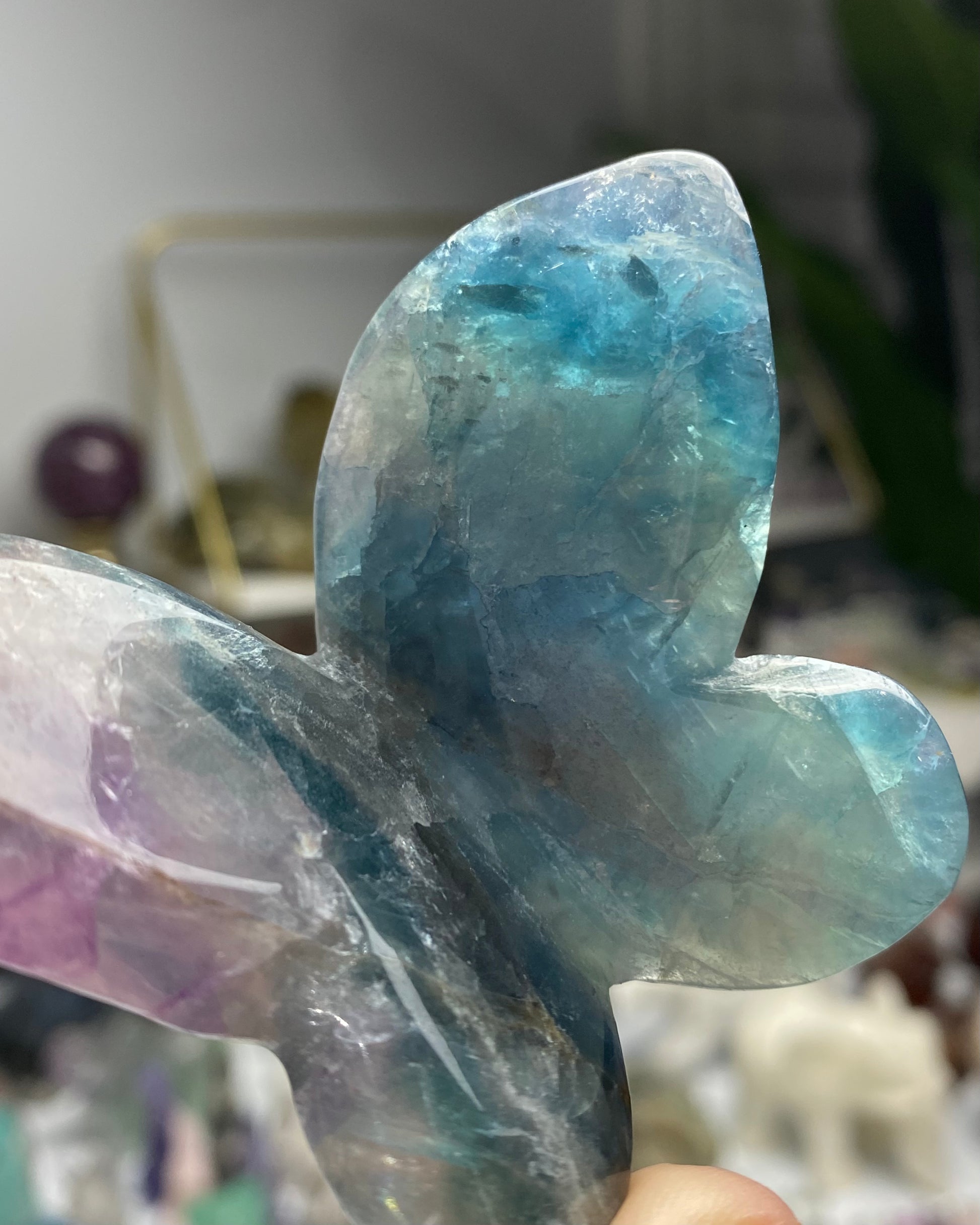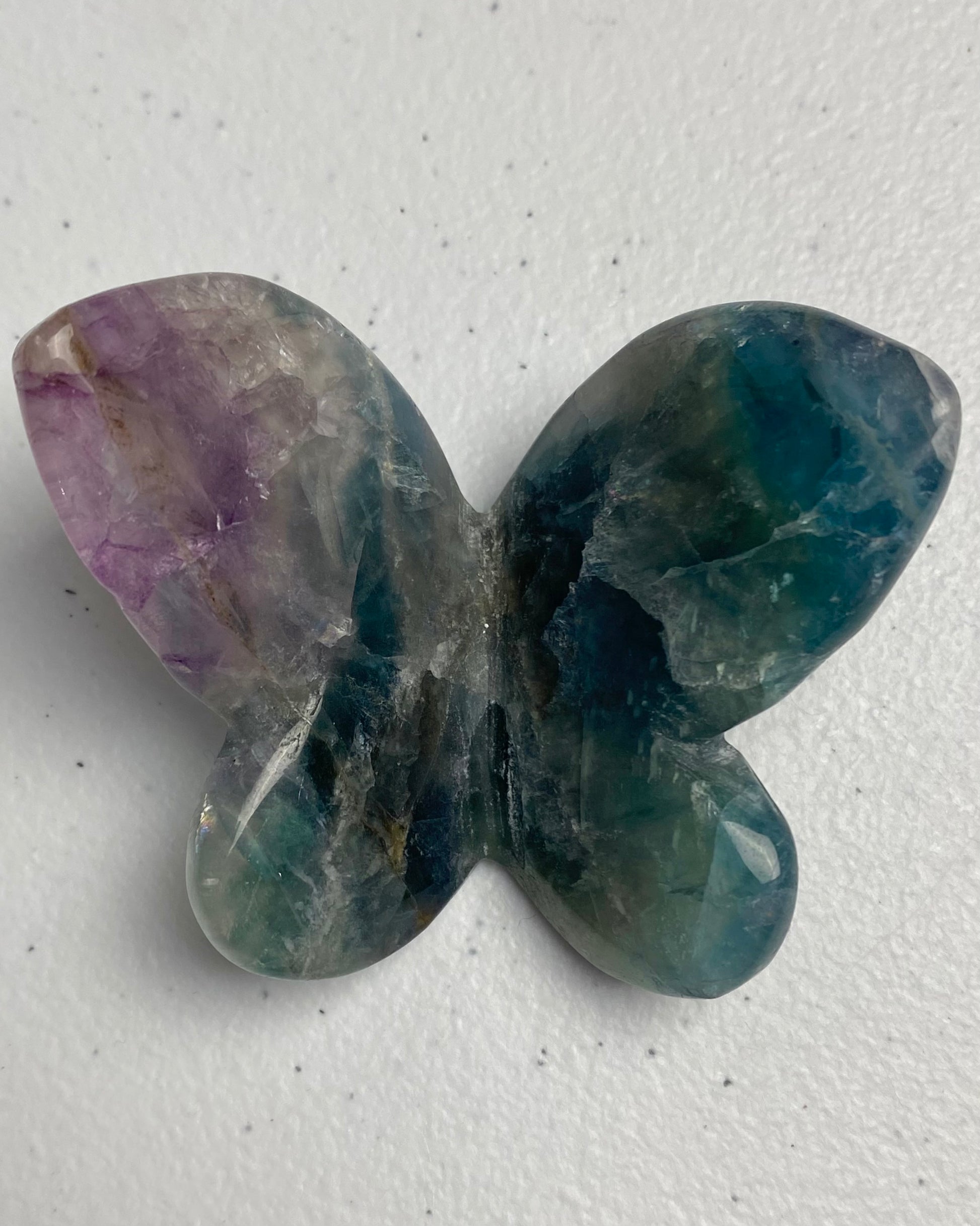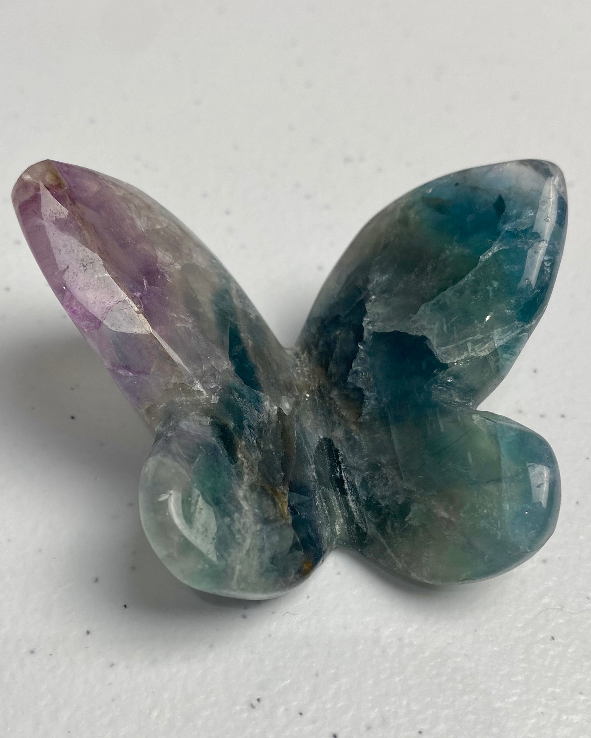 Gorgeous 3D butterfly made in rainbow fluorite. It sits beautifully with its wings up.
