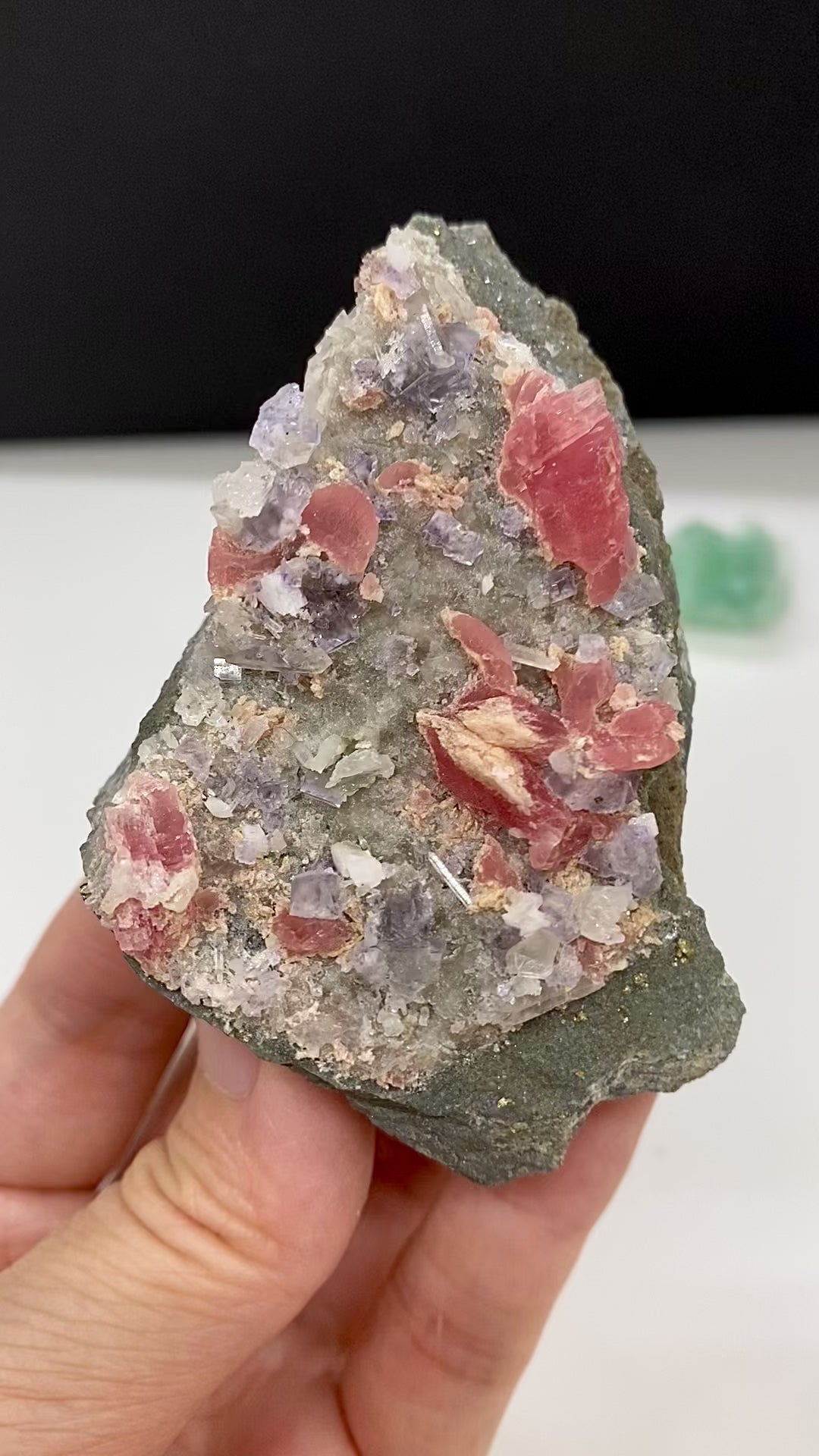 Vibrant red rhodochrosite with purple cubic fluorite, quartz, and a bit of pyrite on the matrix. The rhodochrosite on this piece is bright, not the pale type. This mineral combination is quite sought after. The last picture is under UV light.